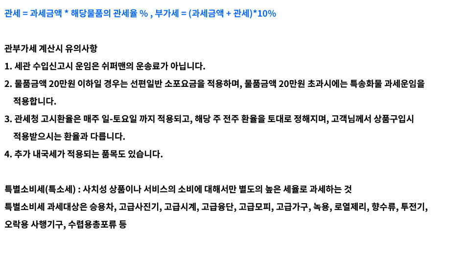 | 개별소비세 | 일반물품의 경우 : 개별소비세과세 가격 = 관세의 과세가격 + 관세 | 농어촌특별세 |